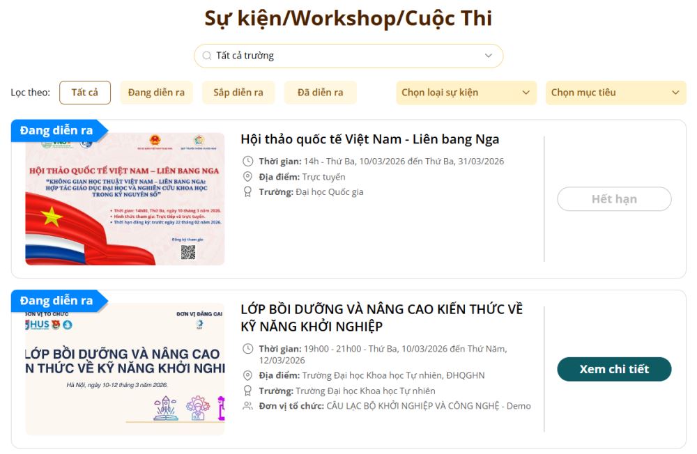 - Lọc theo loại sự kiện: workshop, cuộc thi, khác
