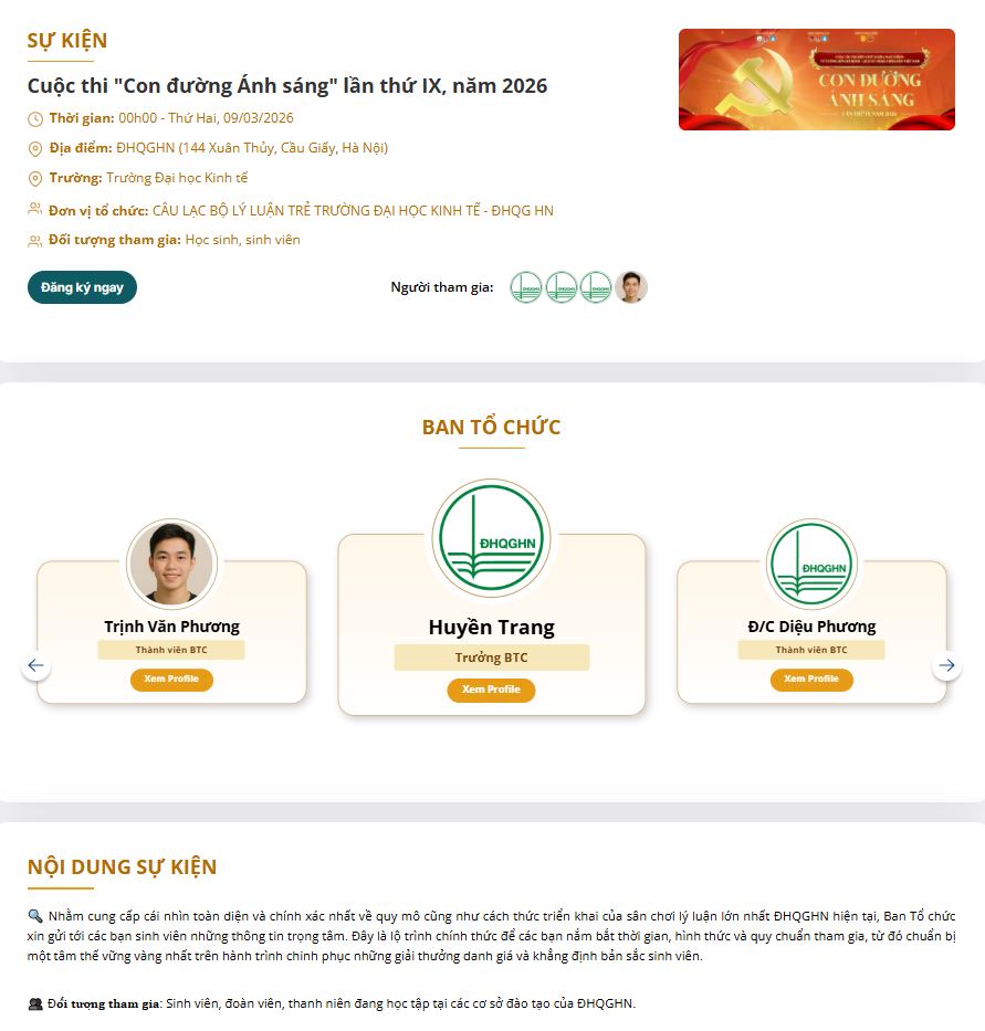 Tại trang chủ, bạn sẽ thấy danh sách các sự kiện đang mở đăng ký hoặc sắp diễn ra.
